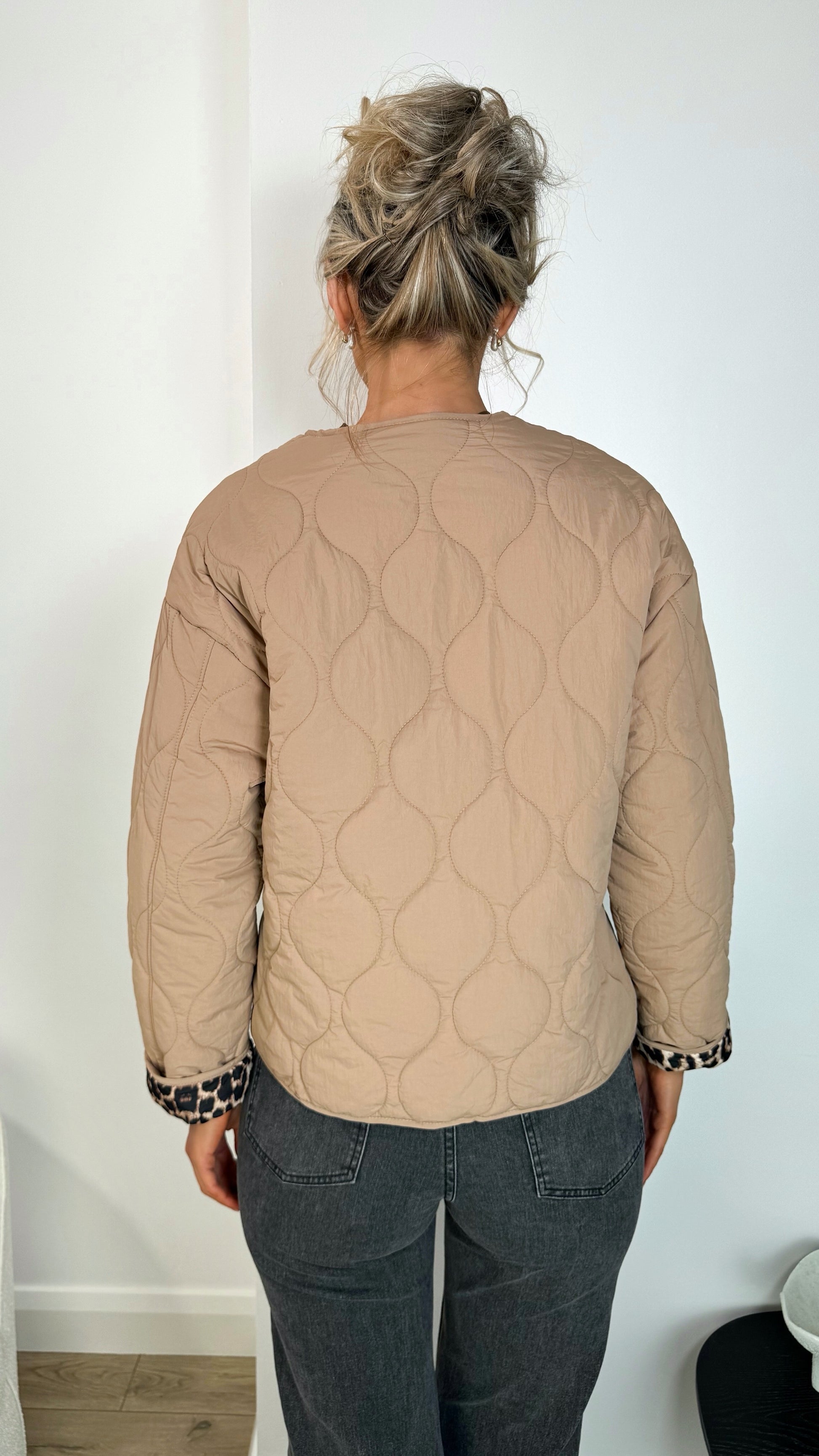 Emily Puffer Jacket with Pockets and Animal Print Details - Beige